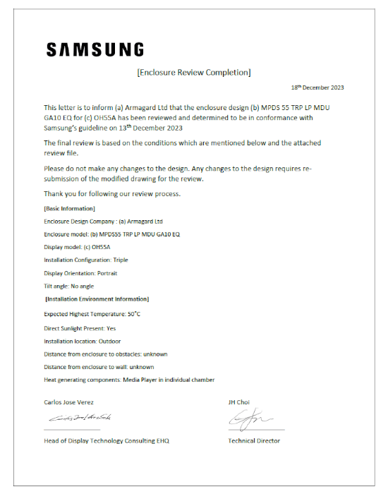 - Les armoires de Samsung aux normes IP56 ne sont pas altérées par la poussière & les fortes pluies.