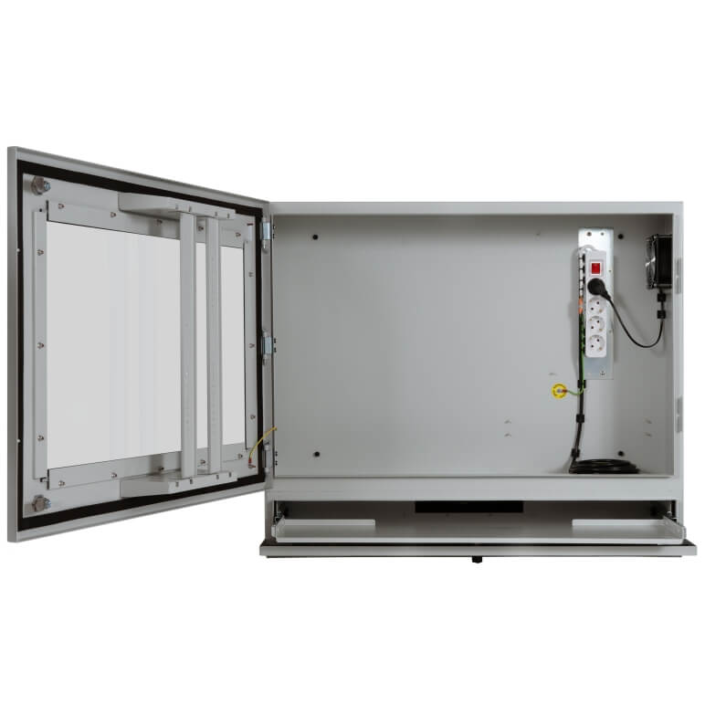 - Plateau coulissant, étagère fixe, clavier IP54 intégré ou plaque d’obturation