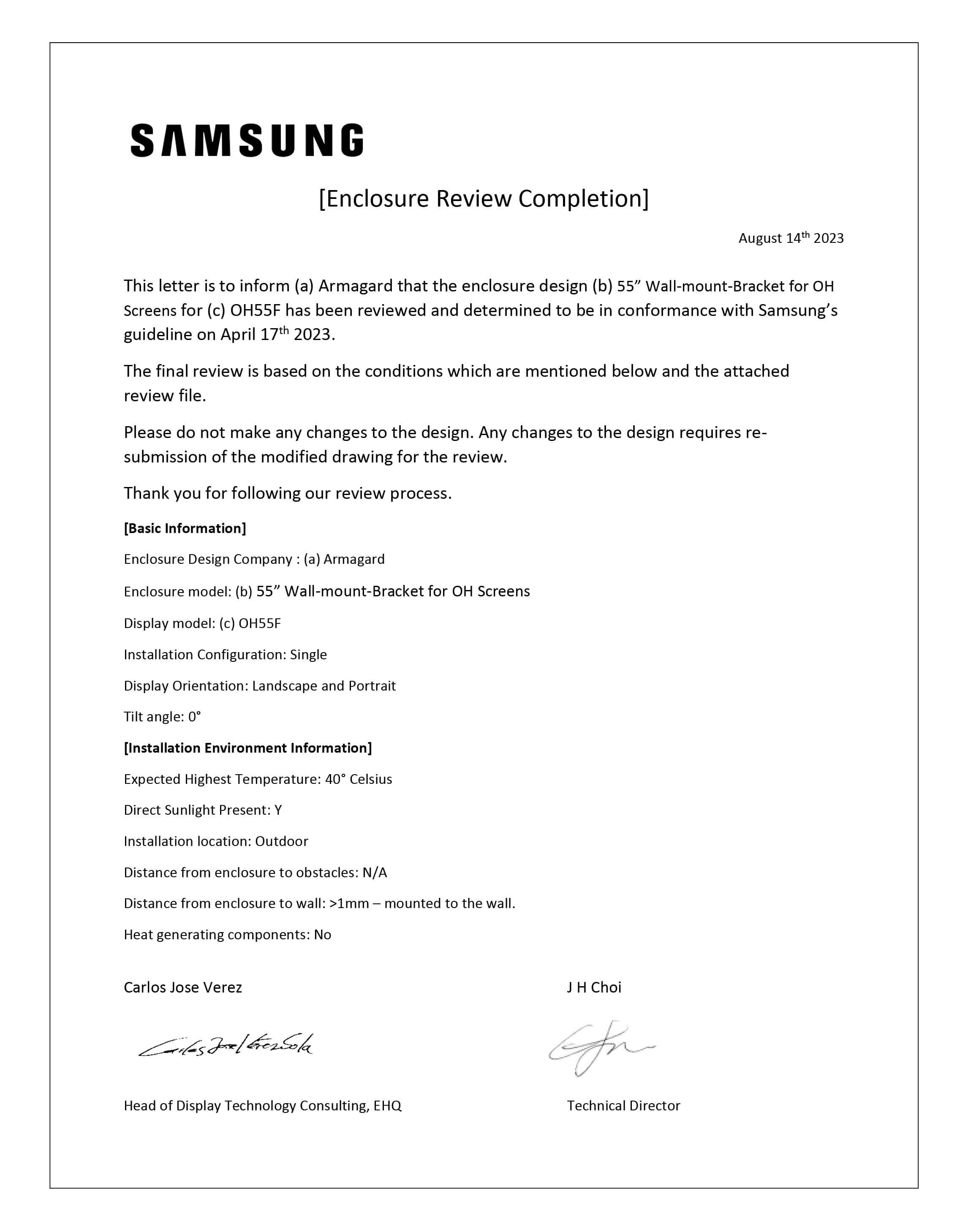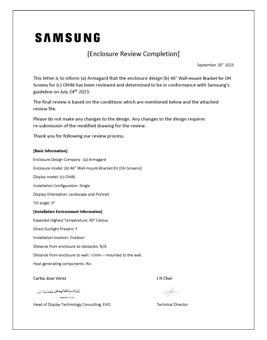 Les supports peuvent être fabriqués pour monter des écrans extérieurs Samsung de 46" ou 55". Les grilles d'aération gèrent le flux d'air pour garder une température constamment froide et empêcher la recirculation d’air chaud. Cette installation rend le montage mural idéal dans des conditions difficiles et humides, ce avec une large plage de température.